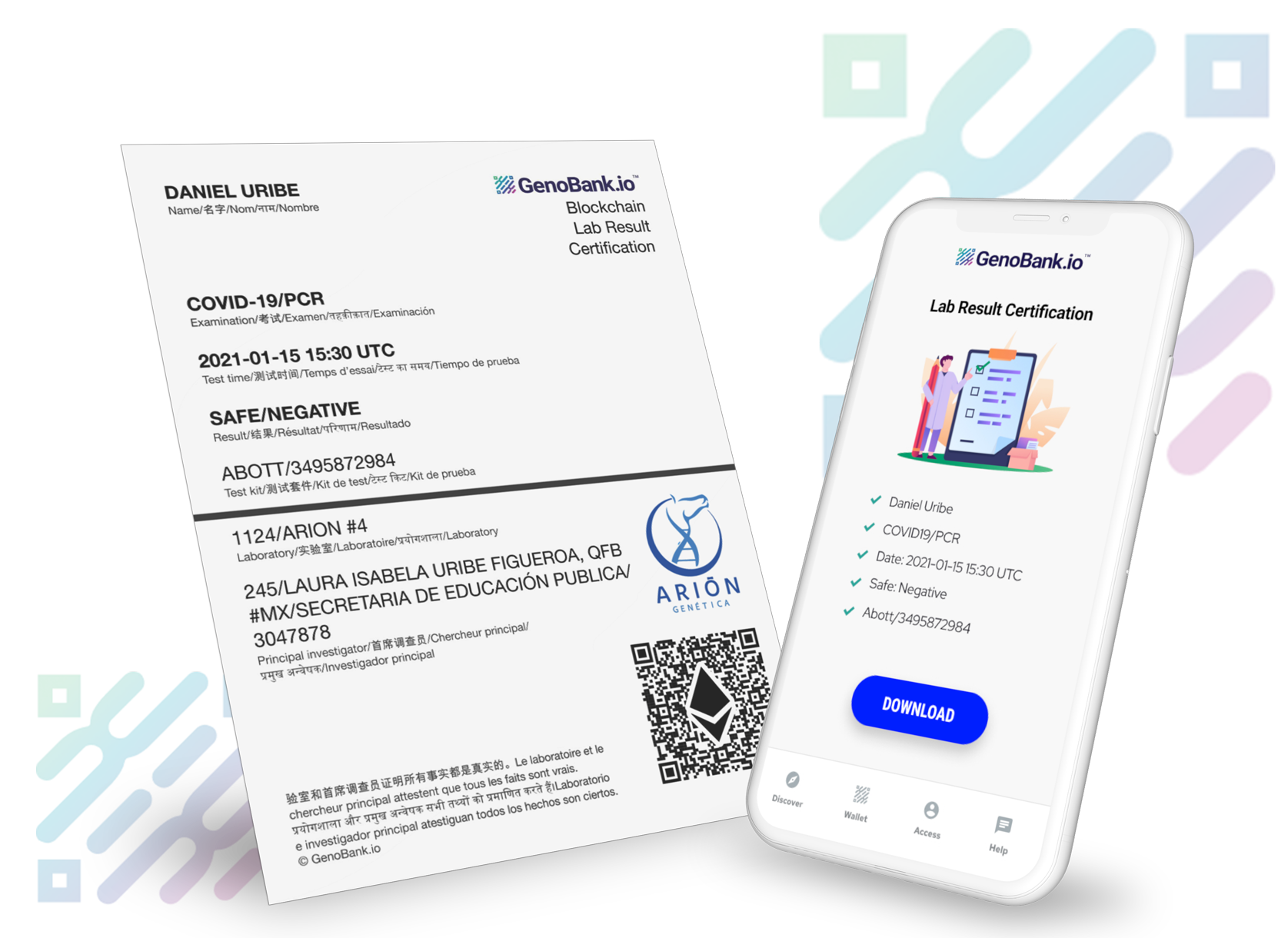 "Our goal is to help travellers get back to their lives faster by giving traceability to COVID lab results. GenoBank.io empowers laboratories by providing a verifiable chain of custody over the lab results of its customers" says GenoBank.io's founder and CEO, Daniel Uribe. "This provides certainty that lab results are not forged or tampered by using a unique cryptographic signature paired to each Lab Rep ID. Results are made immutable upon being recorded into the blockchain and have a time stamp that makes them valid for only 3 days. This is all achieved via a QR code that protects the privacy of users."